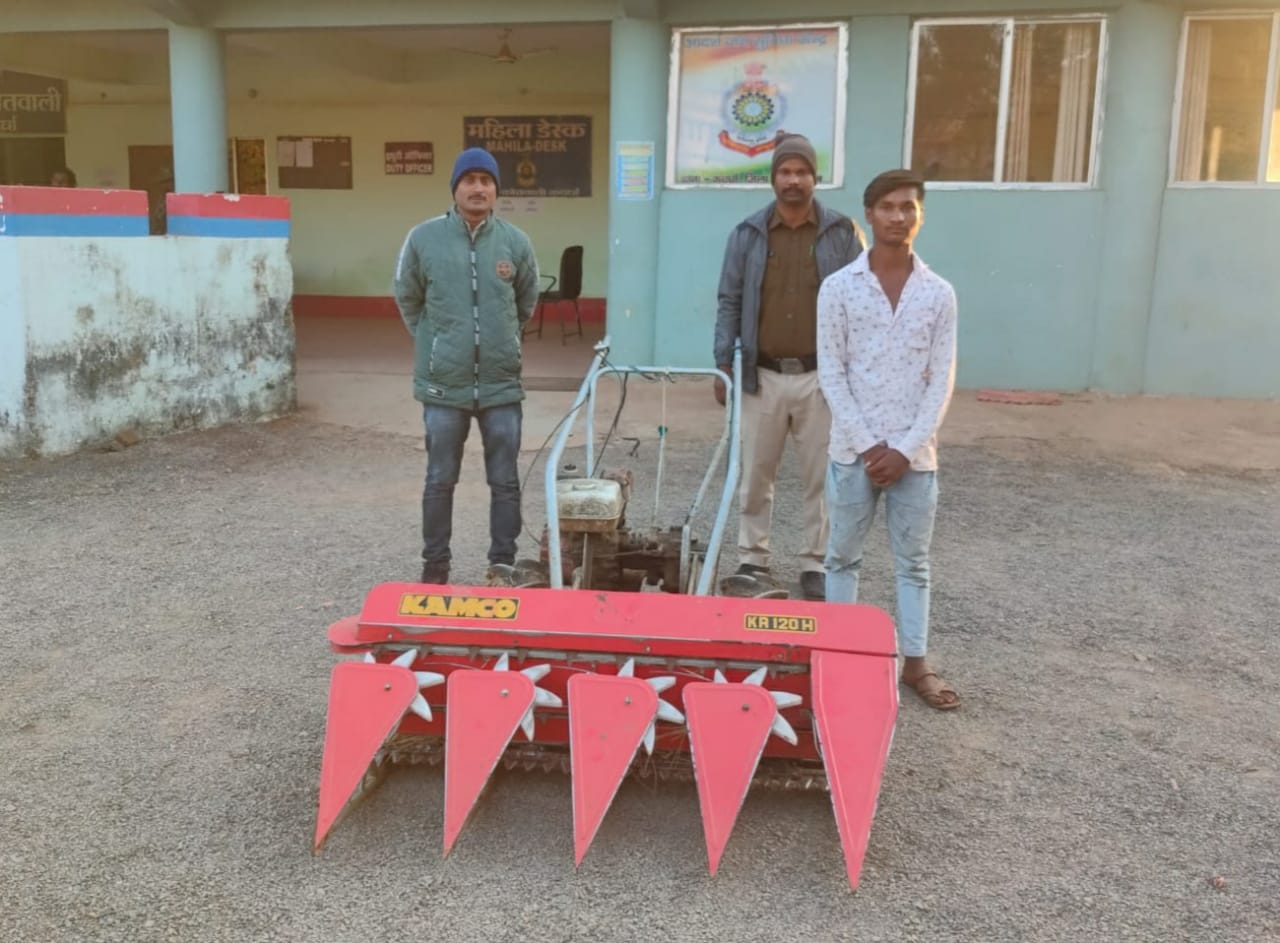 इसी तारतम्य में दिनांक-20/11/2021 को प्रार्थी मिषेश्वर चन्द्रवंशी निवासी ग्राम दौजरी थाना सिटी कोतवाली कवर्धा के द्वारा थाना आकर रिपोर्ट दर्ज कराया की दिनांक- 02/11/2021 के रात्रि 10:00 बजे मैं अपना धान काटने का मशीन को खेत में छोड़कर घर आ गया था, एवं दीपावली त्यौहार होने से त्यौहार के बाद दिनांक- 05/11/2021 को सुबह 07:00 बजे खेत गया तो देखा की मेरा धान काटने का मशीन खेत में नहीं था। तब खेत के आसपास एवं आसपास के गावों में पता किया लेकिन मेरा धान काटने का मशीन नही मिला, जिसे किसी अज्ञात व्यक्ति के द्वारा चोरी कर ले गया है। की रिपोर्ट पर थाना सिटी कोतवाली में अपराध क्रमांक- 902/2021 धारा- 379,34 भा.द.वि. का अपराध पंजीबद्ध कर विवेचना में लिया गया। मामले की गंभीरता को देखते हुए तत्काल थाना प्रभारी द्वारा जिले के वरिष्ठ अधिकारी गणों को अवगत कराया गया वरिष्ठ अधिकारी गणों के निर्देशन में आरोपी एवं चोरी गए मशीन का लगातार पता तलाश किया जा रहा था। जिस पर विवेचना के दौरान मुखबीर की सूचना पर विधि विरुद्ध संघर्षरत् बालक से पूछताछ करने पर उक्त चोरी की घटना को अपने साथी तोखन टोन्ड्रे के साथ मिलकर चोरी की घटना घटित करना एवं चोरी किये गये धान काटने के मशीन को रिश्तेदार के यहां छुपाकर रखना बताये जाने पर बालक के बताये स्थान पर जाकर उक्त चोरी गया मशीन एवं घटना में प्रयुक्त एक होण्डा शाईन मोटर सायकल क्रमांक- CG-09- jj-1206 को जप्त कर आरोपी तोखन टोण्ड्रे, एवं विधि विरुद्ध संघर्षरत बालक को विधिवत गिरफ्तार कर उचित वैधानिक कार्यवाही कर माननीय न्यायालय के समक्ष प्रस्तुत किया गया।