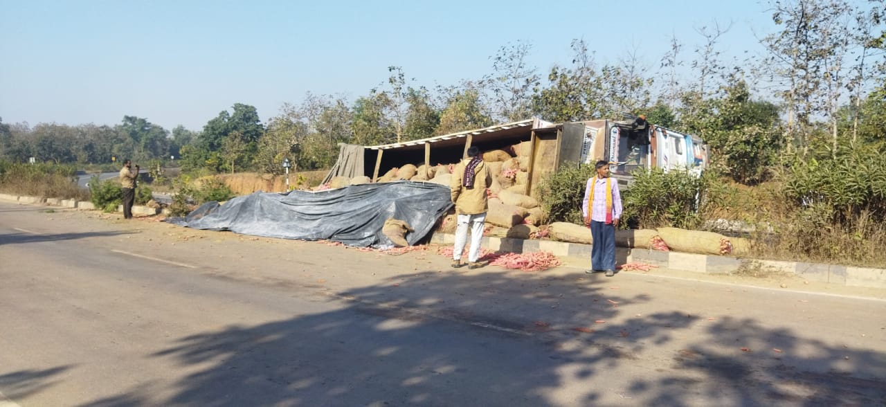 छुरिया – गाजर भर कर जा रही ट्रक तड़के कठुआ पुल के पास पलट गई जिसमें चालक को मामूली चोट आई है। जिनका प्राथमिक उपचार कराया गया है। मिली जानकारी के अनुसार चिचोला पुलिस चौकी क्षेत्र के नेशनल हाईवे 06 में रानीतालाब कठुआ पुल के पास सुबह करीब 4:00 बजे राजस्थान से गाजर लेकर उड़ीसा जा रही ट्रक क्रमांक RJ 19 GF 7472 कठुआ पुल मोड़ में अनियंत्रित होकर पलटी हो गया। जिससे गाजर सड़क में बिखर गया वहीं चालक को मामूली चोट लगी थी।