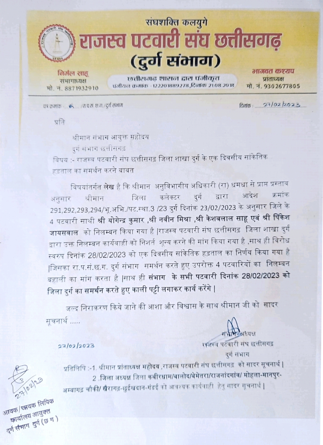 कवर्धा। ज्ञात हो कि अनुविभागीय अधिकारी (रा) धमधा से प्राप्त प्रस्ताव अनुसार जिला कलेक्टर दुर्ग द्वारा आदेश क्रमांक 291,292,293,294/भू.अभि./पट.स्था.3 /23 दुर्ग दिनांक 23/02/2023 के अनुसार जिले के 4 पटवारी साथियो को निलम्बन किया गया है |राजस्व पटवारी संघ छत्तीसगढ़ जिला शाखा दुर्ग द्वारा उक्त निलम्बन कार्यवाही को निशर्त शून्य करने की मांग किया गया है ,साथ ही विरोध स्वरुप दिनांक 28/02/2023 को एक दिवसीय सांकेतिक हड़ताल का निर्णय किया गया है |जिसका रा.प.सं.छ.ग. दुर्ग संभाग भी समर्थन करते हुए निलम्बन बहाली का मांग करते हुए संभाग आयुक्त दुर्ग को ज्ञापन सौपा है|साथ ही संभाग के सभी पटवारी दिनांक 28/02/2023 को जिला दुर्ग का समर्थन करते हुए काली पट्टी लगाकर कार्य करेंगे |