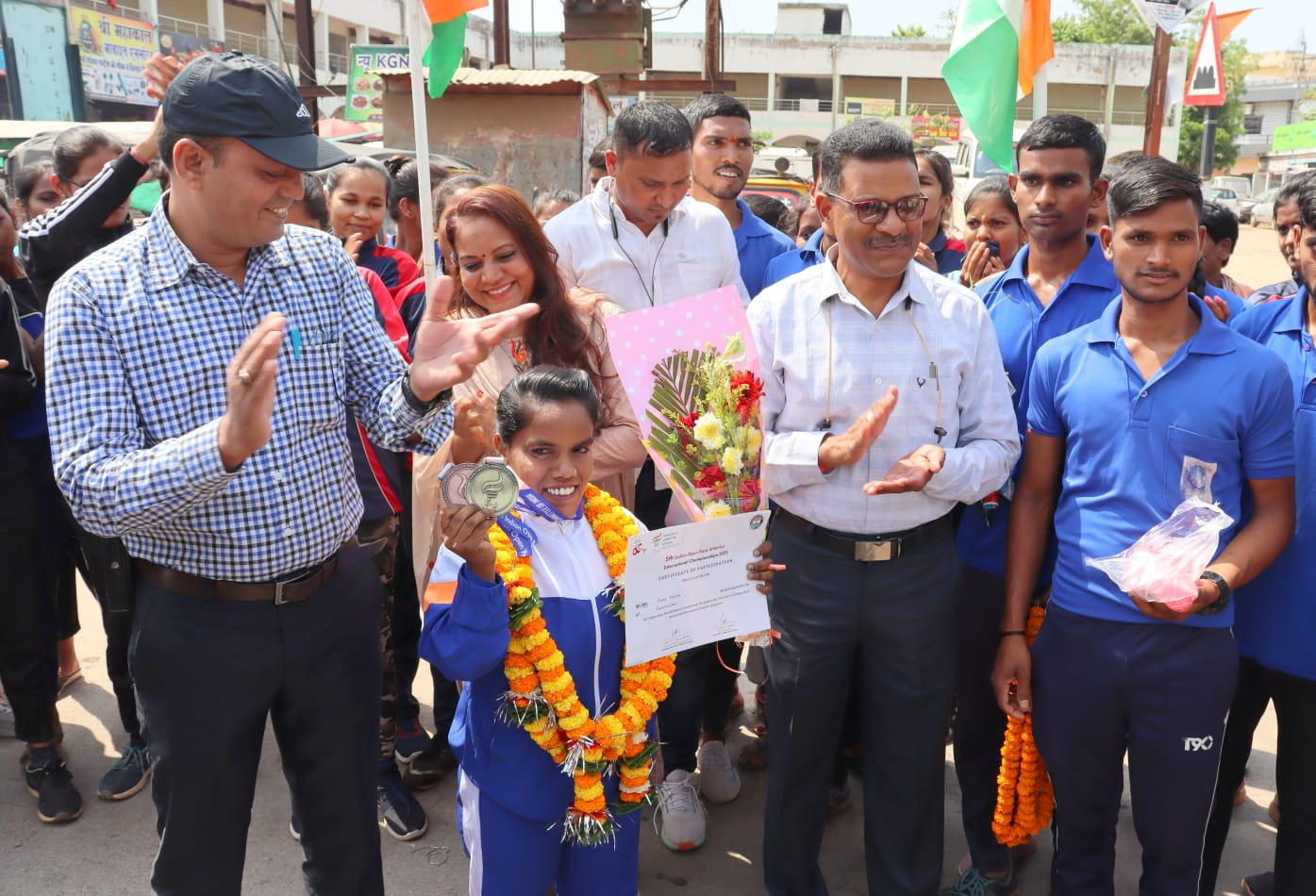 कवर्धा। कबीरधाम पुलिस अधीक्षक डॉ लाल उमेद सिंह एवं उप. पुलिस अधीक्षक मुख्यालय कौशल किशोर वासनिक तथा अधिक संख्या में फोर्स एकेडमी के प्रशिक्षणरत युवक-युवती व खिलाड़ियों ने छोटी मेहरा, कोच/ ट्रेनर वसीम रजा कुरैशी, व संजय पैकरा (Runner) का पुष्पगुच्छ से स्वागत करते हुए विजय तिलक लगाकर उज्जवल भविष्य के लिए शुभकामनाएं देते हुए, तिरंगा रथ पर शहर भ्रमण कराया गया।