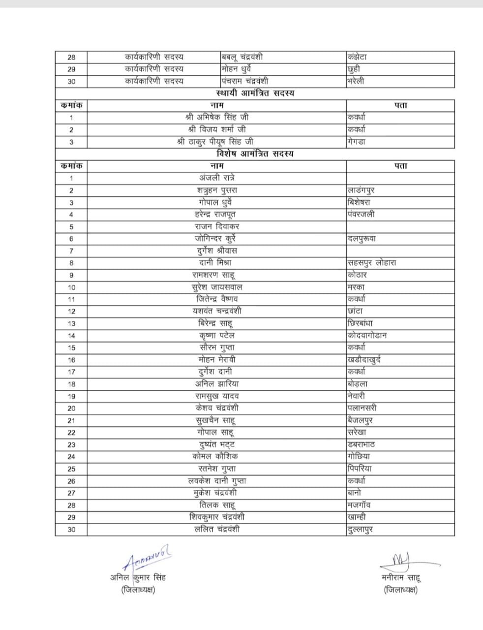 भाजपा युवा मोर्चा जिलाध्यक्ष मनीराम साहू ने अपने कार्यकारिणी मे महामंत्री योगेश चंद्रवंशी, सचिन गुप्ता और उपाध्यक्ष मे राजकुमार मेरावी, मिथलेश बंजारे, तुकेश चंद्रवंशी, अजय ठाकुर, मनोज वैष्णव तथा कोषाध्यक्ष संदीप गुप्ता को बनाया गया है । वही सह कोषाध्यक्ष मे अविनाश शर्मा, सुरेश पटेल को बनाया गया है एवं मंत्री मे नितिश चंद्रवंशी, रामचरण साहू, सुमित तिवारी, हेमचंद चंद्रवंशी, तमन्ना मेहरा को बनाया गया है तथा जिला कार्यकारिणी सदस्य मे नरोत्तम साहू, हर्षद सिंह बैस, बलराम टाण्डिया, सोनू चंद्रवंशी, कृष्णा वर्मा, लक्ष्मीनायण साहू, रेखचंद पटेल, सुनील यादव, आकाश तिवारी, रूपेश चंद्रवंशी, रामकिशन चन्द्राकर, लाला कौशिक, अमन बिसारिया, कपील चंद्रवंशी, धनराज चंद्रवंशी, जयराम साहू, पंचराम जायसवाल, गोपाल साहू, प्रितेश चिचाम, रामानुज पाली, नरेश साहू, रितिक तिवारी, मुकेश कोसले, कपील श्रीवास, कोमल कौशिक, विजय नाविक, सौरभ शर्मा, बबलू चंद्रवंशी, मोहन धुर्वे, पंचराम चंद्रवंशी को कार्यकारिणी सदस्य बनाया गया है। वही कार्यालय प्रभारी नीलेश चंद्रवंशी को एवं सह कार्यालय प्रभारी मे अविनाश शर्मा, सुरेश पटेल को बनाया गया है । जिला प्रचार/प्रसार प्रमुख मे शिव कुम्भकार है । जिला प्रशिक्षण प्रमुख मे अनिल साहू, देवा चौबे है , वही जिला मीडिया प्रमुख मे सुरेश ठाकुर, योगेश महाजन, कृष्णा साहू शामिल है। नीति व अनुसंधान प्रमुख मे अनिल चंद्रवंशी एवं नीति व अनुसंधान सह प्रमुख रमेश यादव है। जिला सोशल मीडिया प्रमुख मे राजेश दिवाकर, अजय यादव, आकाश गुप्ता, योगेश ठाकरे है। जिला शा. यो. स्वा. मंडल प्रमुख मे कलेक्टर बैगा, मुलचंद साहू है एवं जिला कन्या शक्ति संयोजिका मे हेमलता नामदेव, ज्योति डेमेश, गायत्री डहरिया को बनाया गया है वहीं खेल एवं युवा प्रमुख मे विष्णु साहू और खेल एवं युवा सह प्रमुख आनंद वर्मा है।वही स्थायी आमंत्रित सदस्य मे अभिषेक सिंह , विजय शर्मा , ठाकुर पीयूष सिंह को बनाया गया है और अजंली रात्रे, शत्रुहन पुसरा, गोपाल धुर्वे, हरेन्द्र राजपूत, राजन दिवाकर, जोगिन्दर कुर्रे, दुर्गेश श्रीवास, दानी मिश्रा, रामशरण साहू, सुरेश जायसवाल, यशवंत चंद्रवंशी, बिरेन्द्र साहू, कृष्णा पटेल, सौरभ गुप्ता, मोहन मेरावी, दुर्गेश दानी, अनिल झारिया, रामसुख यादव, केशव चंद्रवंशी, सुखचैन साहू, गोपाल साहू, दुष्यंत भट्ट, कोमल कौशिक, रतनेश गुप्ता, लवकेश दानी गुप्ता, मुकेश चंद्रवंशी, तिलक साहू, शिवकुमार चंद्रवंशी, ललित चंद्रवंशी को विशेष आमंत्रित सदस्य बनाया गया है ।