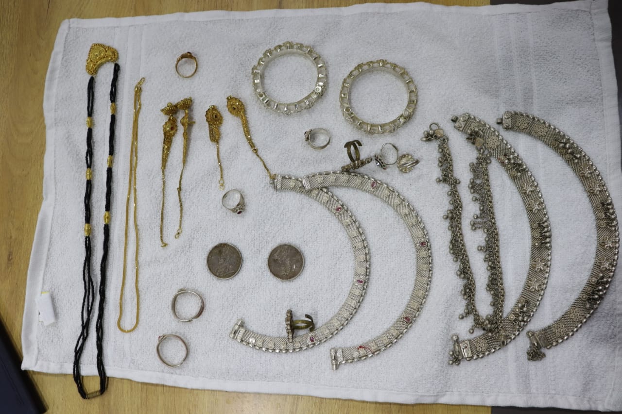 राजनांदगांव। मामले सक्षिप्त विवरण इस प्रकार है कि दिनाक 15.05.2023 को रात्री 12.00 से 2.00 बजे के मध्य प्रार्थी गोंविन्द प्रसाद वर्मा ग्राम बहेराभाठा के घर अज्ञात चोर सीढ़ी के सहारे चढ़कर घर के अन्दर कमरा में जाकर गोदरेज आलमारी खोलकर मषरुका सोने चादी के जेवरात व नगदी रकम चालीस हजार रुपये चोरी कर ले गये है, प्रार्थी की रिपोर्ट पर थाना घुमका में अपराध क्रमांक 56/23 धारा 457, 380 भादवि एवं 57/23 धारा 457, 380 भादवि पंजीबंध कर विवेचना में लिया गया और इस संबंध में वरिष्ठ अधिकारियों को जानकारी दी गई। मामले की गंभीरता को देखते हुए वरिष्ठ पुलिस अधीक्षक अभिषेक मीणा के निर्देशन में अतिरिक्त पुलिस अधीक्षक लखन पटले के मार्गदर्शन में तथा पुलिस अनुविभागीय अधिकारी डोंगरगांव श्रीमती नेहा वर्मा के पर्यवेक्षण मे सायबर सेल एवं थाना घुमका की टीम गठित कर आरोपी पतासाजी हेतु लगाया गया था। स्टाफ् के द्वारा क्षेत्र के सीसीटीवी फुटेज खंघाला गया व मुखबीर से सूचना मिलने पर संदेही प्रेम सिंग पारधी, शकंर सतनामी व बुधारूराम यादव को हिरासत में लेकर कड़ाई से पूछताछ किया गया जो चोरी की घटना कारित करना स्वीकार किये। सभी ने चोरी के संबंध में खुलासा करते हुये बताया कि प्रार्थी गोविंद के ग्राम बहेराभाठा के घर से सोना, चांदी के जेवरात एवं नगदी रकम चोरी किये हैं। सभी आरोपी को मेमोरण्डम कथन लेकर इनके कब्जे से 01 सोने की चेन, 1 सोने का सोने का मंगलसूत्र, चांदी की पायल 02 जोडी, 01 जोडी चांदी की पैर पटटी, चांदी का कंगन, 03 जोडी चांदी की बिछिया, 01 जोडी चांदी कि बिछिया पुराना, 02 चांदी का सिक्का, 01 जोडी सोने का झुमका, 01 जोडी सोने का एयरिंग एवं नगदी रकम 7500/- रूपया जुमला किमती करीब तीन लाख रुपये एवं घटना में प्रयुक्त मोटर सायकल बरामद किया गया।