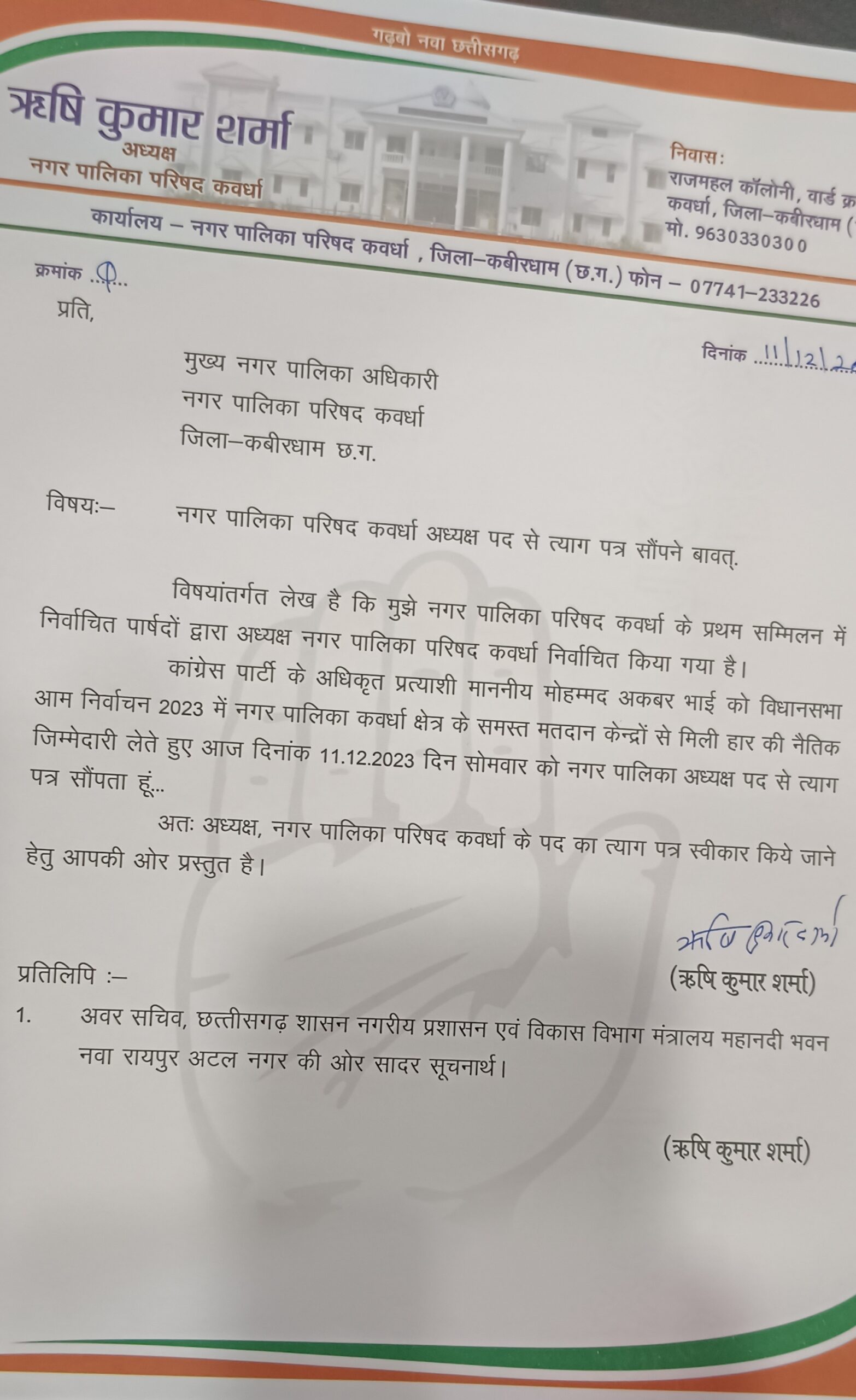श्री शर्मा ने अपने त्याग पत्र में लिखा है कि कांग्रेस पार्टी के अधिकृत प्रत्याशी मोहम्मद अकबर भाई को विधानसभा आम निर्वाचन 2023 में नगर पालिका कवर्धा क्षेत्र के समस्त मतदान केंद्र में मिली हार की नैतिक जिम्मेदारी लेते हुए आज नगरपालिका अध्यक्ष पद से त्यागपत्र नगर पालिका अधिकारी को सौंपा है।