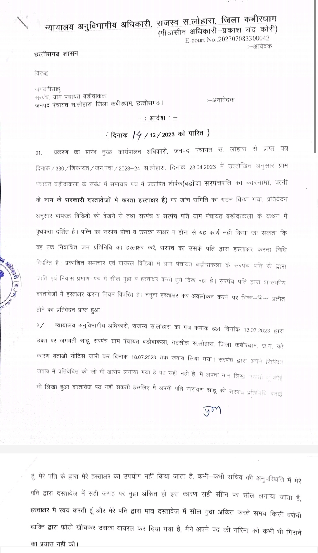 कवर्धा। कबीरधाम जिले के सहसपुर लोहारा ब्लॉक के ग्राम पंचायत बड़ौदा कला का सोशल मीडिया मे जमकर एक वीडियो वायरल हुआ जिसमें सरपंच पति द्वारा सरकारी दस्तावेज मे दस्तखत करते हुए दिख रहे है, जिसे प्रशासन ने तत्काल संज्ञान लेते हुए जांच कमेटी बनाई गई जिसमें पूरे मामले को जांच कर अनुविभागीय अधिकारी लोहारा को अपना रिपोर्ट सौपा गया। अनुविभागीय अधिकारी लोहारा द्वारा पूरे मामले की बारकी से जांच कर जांच में मामला सही पाया जाने पर महिला सरपंच जगबति साहू को धारा 40 के तहत बर्खास्त किया गया।