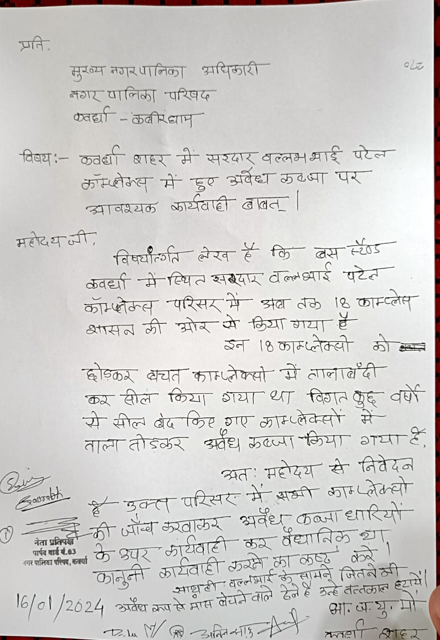 कवर्धा। कवर्धा शहर में स्थित सरदार वल्लभभाई पटेल व्यवसायिक परिसर में कुल 69 दुकान है जिसमे से 18 दुकानों को व्यवस्थापन पर आबंटित किया गया है 18 दुकानों के अलावा जितने भी कॉम्प्लेक्स है उन पर विगत वर्षों में नगरपालिका द्वारा किये गए सील को तोड़कर अतिक्रमण किया जा चुका है जिसपर नगरपालिका गहरी नींद में सोयी हुई है अवैध कब्जाधारियों के ऊपर तत्काल कानूनी कार्यवाही करने साथ ही साथ वल्लभभाई कॉम्प्लेक्स के सामने अवैध रूप से ठेला लगाया गया है जिसमें मांस का व्यवसाय किया जाता है जिससे यातायात बाधित भी होता है।