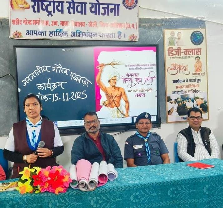 कवर्धा। शहीद नरेन्द्र शर्मा शासकीय उच्चतर माध्यमिक विद्यालय रवेली में राष्ट्रीय सेवा योजना के स्वयंसेवकों के द्वारा 01 नवम्बर से 15 नवम्बर 2025 तक जनजाति गौरव दिवस पखवाड़ा कार्यक्रम का आयोजन किया गया जिसमें विद्यालय के विद्यार्थी विभिन्न गतिविधियों में शामिल हुए , जनजाति नायकों के सन्दर्भ में उद्बोधन में प्रथम द्वितीय,तृतीय क्रमशः दुर्गा, देवेंद्र,दुर्गेश रहा, कविता लेखन में पीहू डाहिरे, रंगोली प्रतियोगिता में दीपाली चंद्रवशी , निबंध लेखन में मूलचंद भास्कर, भाषण संवाद , चित्रकला प्रतियोगिता में अर्चना निषाद,आकांक्षा चंद्रवंशी,मूलचंद ,दीपाली चंद्रवंशी ने शानदार चित्रकला प्रस्तुत किया l