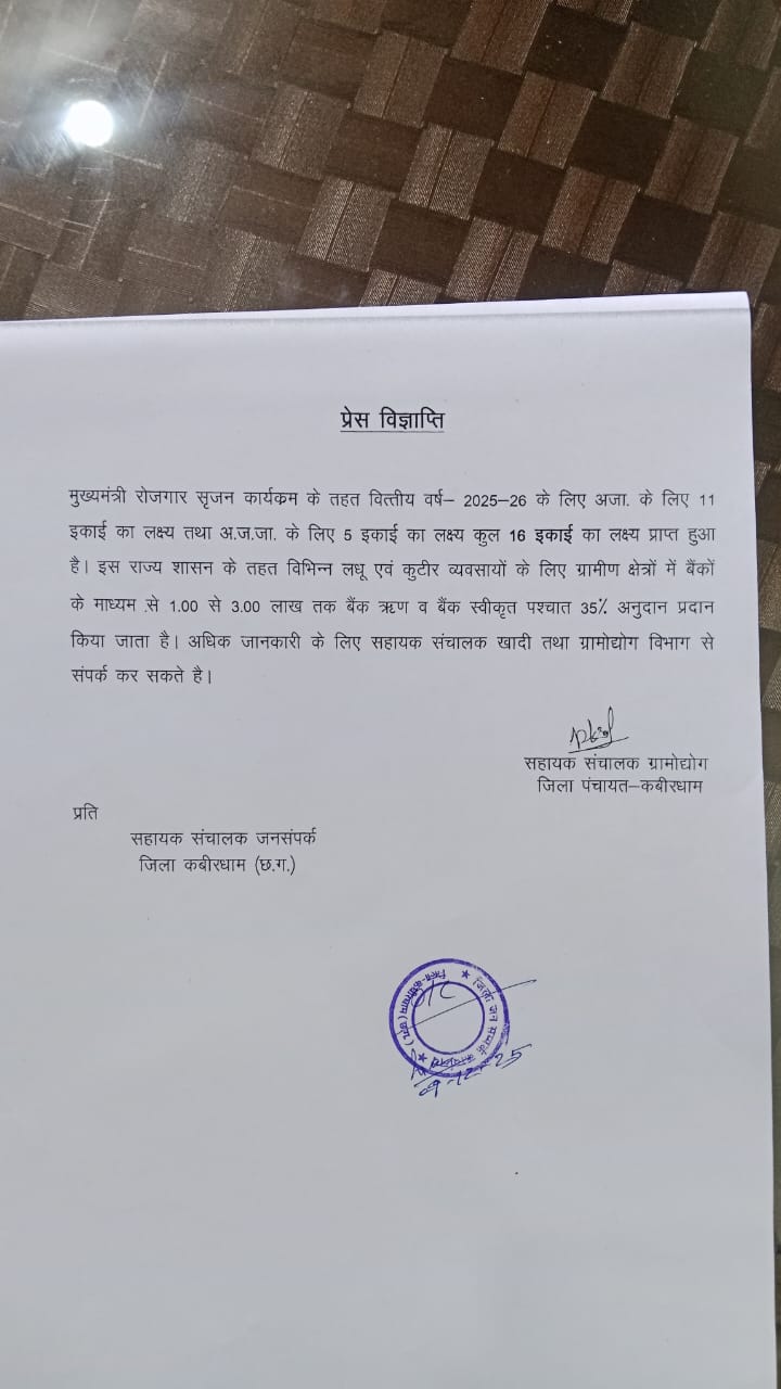 कवर्धा। मुख्यमंत्री रोजगार सृजन कार्यक्रम के तहत वित्तीय वर्ष 2025-26 के लिए अजा के लिए 11 इकाई का लक्ष्य रखा गया है। अजजा के लिए 5 इकाई का लक्ष्य कुल 16 इकाई का लक्ष्य प्राप्त हुआ है। इस राज्य शासन के तहत विभित्र लघु एवं कुटीर व्यवसायों के लिए ग्रामीण क्षेत्रों में बैंकों के माध्यम से 1 से 3 लाख तक बैंक ऋण व बैंक स्वीकृत पश्चात 35 प्रतिशत अनुदान प्रदान किया जाता है। इसका लाभ लघु व कुटिर व्यवसायी उठा सकते हैं। अधिक जानकारी के लिए सहायक संचालक खादी तथा ग्रामोद्योग विभाग से संपर्क कर सकते है।