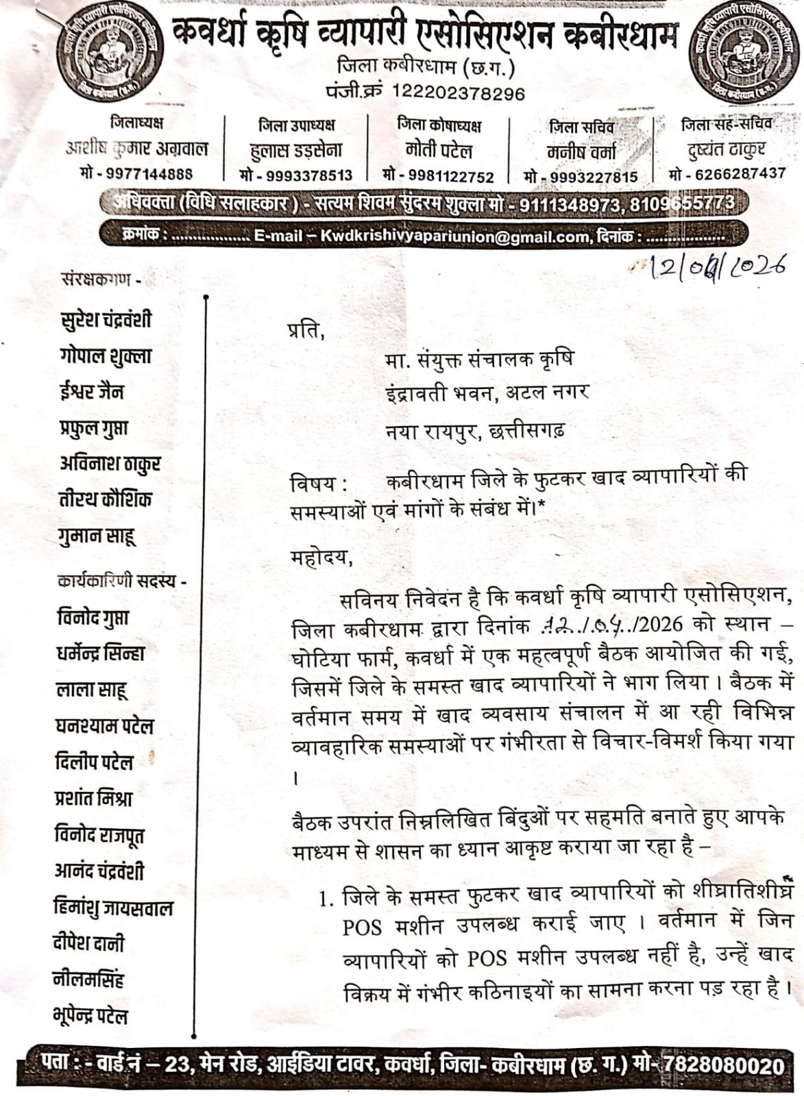 इसी समस्या सहित विभिन्न मांगों को लेकर कवर्धा कृषि व्यापारी एसोसिएशन द्वारा 12 अप्रैल 2026 को घोटिया फार्म हाउस, कवर्धा में एक महत्वपूर्ण बैठक आयोजित की गई। बैठक में जिलेभर के खाद व्यापारियों ने भाग लेकर वर्तमान समय में खाद व्यवसाय संचालन के दौरान आ रही व्यावहारिक समस्याओं पर विस्तार से चर्चा की।